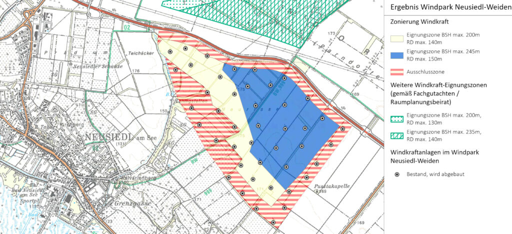 Aufgabe dieses Projekts war die Untersuchung von Windkraft-Eignungszonen in den Gemeinden Neusiedl-Weiden, Pama, Deutschkreutz und Nikitsch und Halbturn. Dafür war es notwendig, eine strategische Umweltprüfung durchzuführen sowie die Ergebnisse in eine verordnungsfähige Festlegung von Eignungszonen und kleinräumigen Ausschlusszonen fachlich überzuführen.